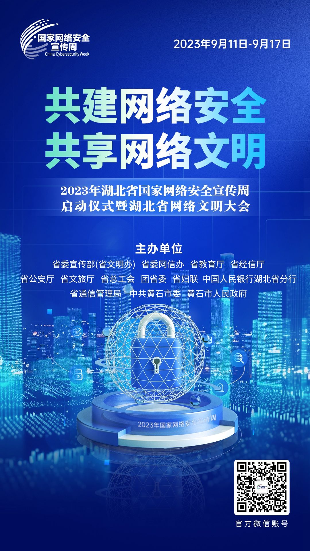 2023年湖北省國家網絡安全宣傳周暨湖北省網絡文明大會由省委宣傳部(省文明辦)、省委網信辦、省教育廳、省經信廳、省公安廳、省文旅廳、省總工會、團省委、省婦聯(lián)、中國人民銀行湖北省分行、省通信管理局、中共黃石市委、黃石市人民政府共同主辦。