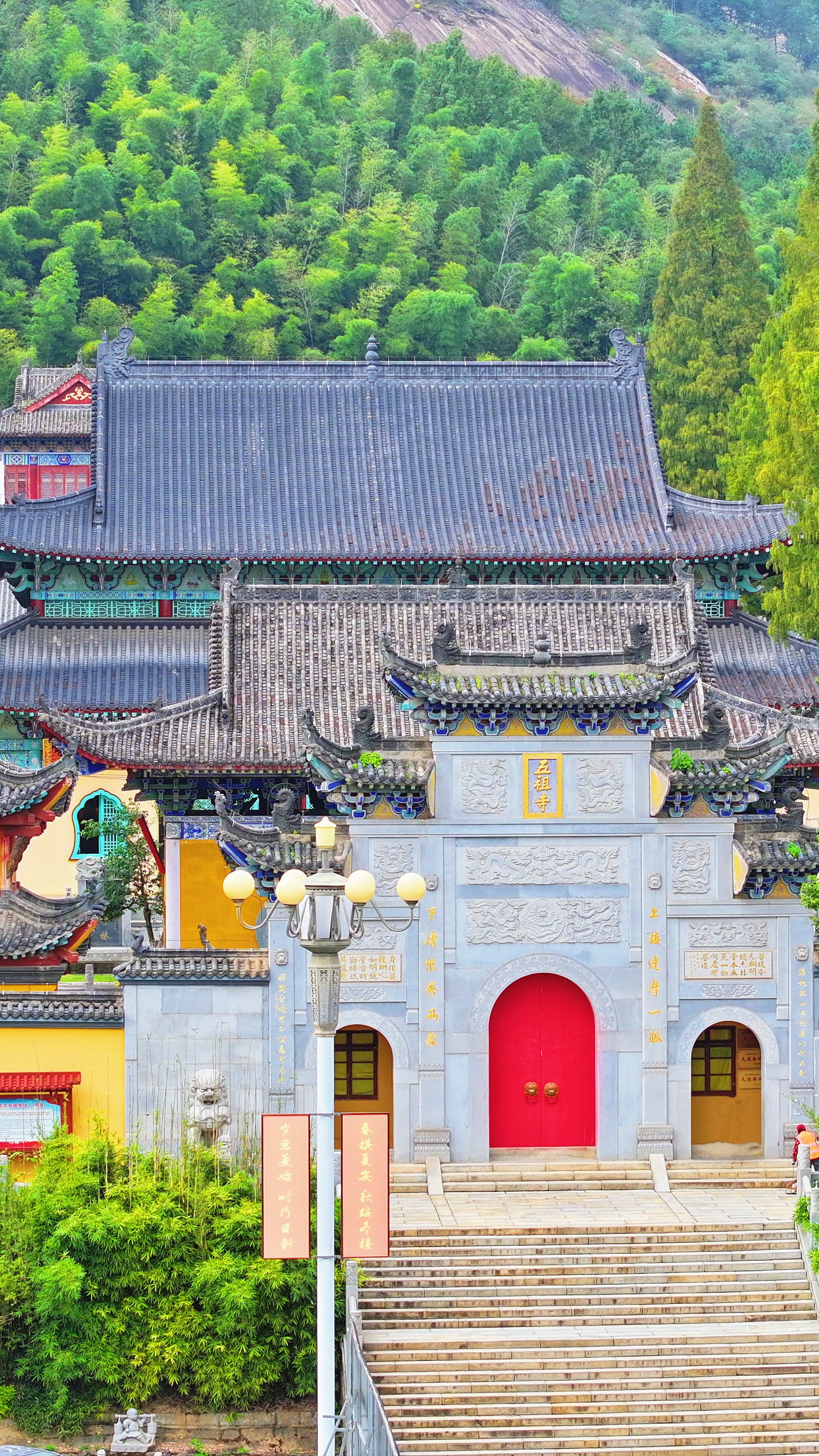 終點處山門,是古代通往五祖寺的必經(jīng)之路。古山門始建于唐大中年間,迄今1100年歷史。山門用青麻石柳筑而成,為城樓式,古樸典雅,莊重大方。