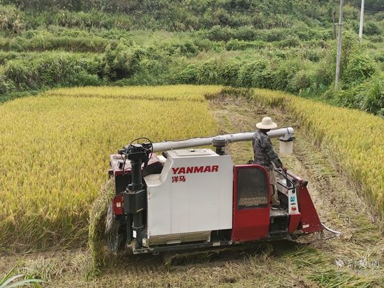 荊楚網(wǎng)(湖北日報(bào)網(wǎng))訊(通訊員 吳儀)11月6日,通山縣南林橋鎮(zhèn)湄溪村鄉(xiāng)林合作社再生稻種植基地上千余畝水稻大部分收割完畢,收割機(jī)在稻田里穿梭收尾,一株株稻穗換來金燦燦的稻粒,鄉(xiāng)間沃野一派豐收景象。