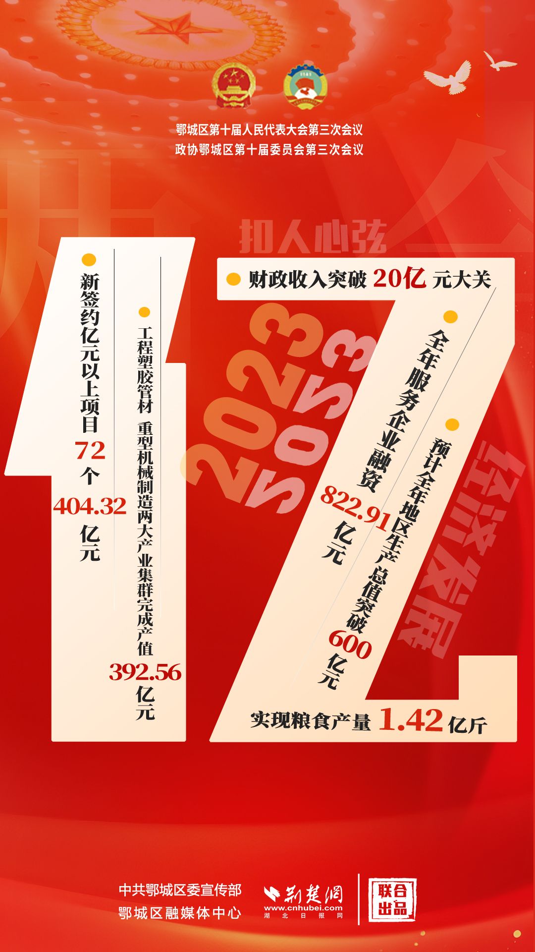 “億”解釋:2023年經(jīng)濟(jì)社會發(fā)展中,新簽約億元以上項(xiàng)目72個(gè)404.32億元,工程塑膠管材、重型機(jī)械制造兩大產(chǎn)業(yè)集群完成產(chǎn)值392.56億元,全年服務(wù)企業(yè)融資822.91億元,實(shí)現(xiàn)糧食產(chǎn)量1.42億斤,預(yù)計(jì)全年地區(qū)生產(chǎn)總值突破600億元,財(cái)政收入突破20億元,全區(qū)民生投入21.6億元。
