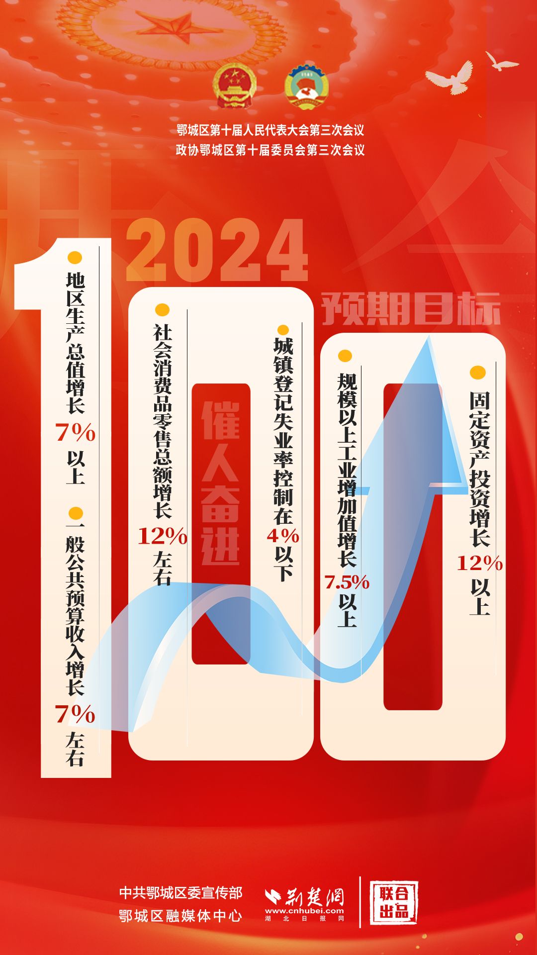“100”解釋:2024年經(jīng)濟(jì)社會發(fā)展主要預(yù)期目標(biāo)是,地區(qū)生產(chǎn)總值增長7%以上,一般公共預(yù)算收入增長7%左右,社會消費(fèi)品零售總額增長12%左右,城鎮(zhèn)登記失業(yè)率控制在4%以下,規(guī)模以上工業(yè)增加值增長7.5%以上,固定資產(chǎn)投資增長12%以上,服務(wù)業(yè)增加值增長7.5%左右。