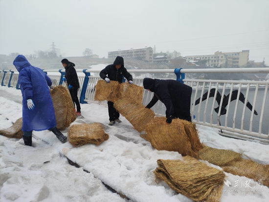 2月22日上午,在東洲橋路段掃雪現(xiàn)場,赤壁市建工集團工作人員正頂風冒雪手持鐵鍬、雪鏟等清掃工具,鏟除橋梁上的積雪,鋪設(shè)草毯防滑。