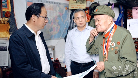 當(dāng)天上午,黃石市委宣傳部副部長、市委網(wǎng)信辦主任萬金光,黃石市退役軍人事務(wù)局黨組書記、局長陳鵬圖一行參加啟動儀式,并前往抗美援朝老戰(zhàn)士瞿介昌住處看望。他們向瞿介昌老戰(zhàn)士簡單介紹了本次主題報道情況,向這位老英雄獻上了鮮花,表達了對退役軍人的敬意,并為“致敬英雄”采訪團授旗。