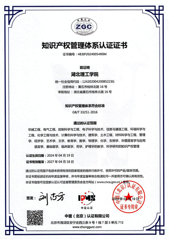 今年3月26日至29日,中崮(北京)認(rèn)證有限公司派出專(zhuān)家組進(jìn)駐該校,通過(guò)個(gè)別訪談、實(shí)地走訪、資料查閱等方式展開(kāi)現(xiàn)場(chǎng)審核和對(duì)標(biāo)驗(yàn)收。經(jīng)審核考察,專(zhuān)家組對(duì)湖北理工學(xué)院知識(shí)產(chǎn)權(quán)管理工作給予了高度肯定,并一致同意該校通過(guò)知識(shí)產(chǎn)權(quán)管理體系認(rèn)證。