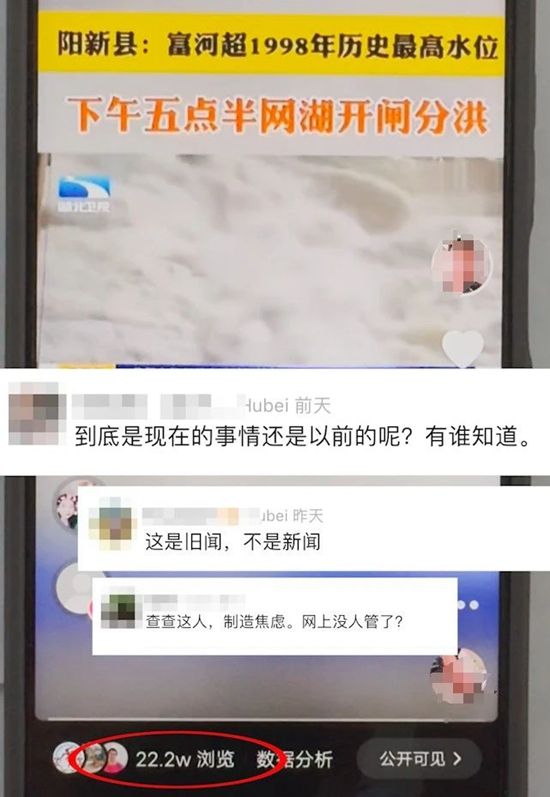該視頻一經(jīng)發(fā)布,立即引起了廣大網(wǎng)民的關(guān)注和擔(dān)憂,誤導(dǎo)網(wǎng)民認(rèn)為發(fā)生了洪災(zāi)險(xiǎn)情。相關(guān)視頻發(fā)布后瀏覽量達(dá)22.2萬人次,在一定程度上引發(fā)了公眾恐慌。
