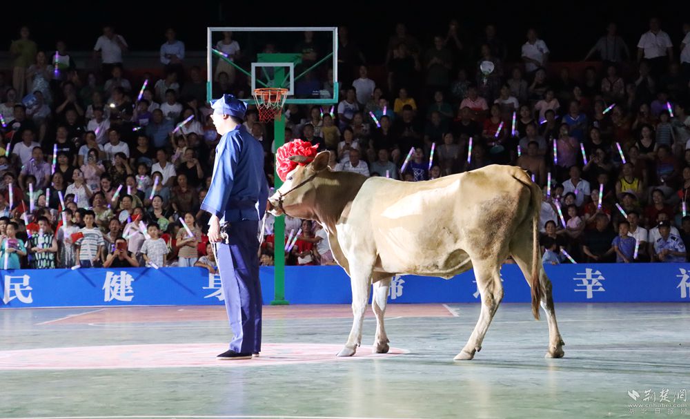 19時(shí)30分許,開幕式開始,聲聲震天的威風(fēng)鑼鼓、剛勁有力的武術(shù)表演、青春動(dòng)感的健身舞蹈以及活力十足的歌曲串燒,一次次引來現(xiàn)場的歡呼喝彩。當(dāng)工作人員牽著“冠軍?!边M(jìn)入場地那一刻,現(xiàn)場的熱烈氛圍再次被引向高潮。