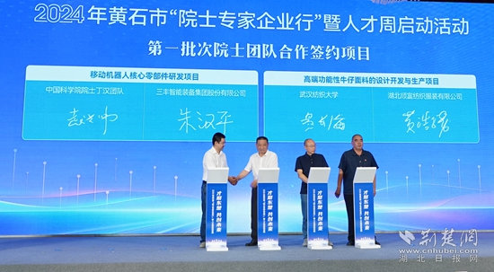 現(xiàn)場還舉行了項目簽約活動,簽約移動機器人核心零部件研發(fā)項目、高端功能性牛仔面料的設(shè)計開發(fā)與生產(chǎn)項目等2個院士專家合作項目、球墨鑄鐵管壁測量項目等10個人才合作項目以及4個人才服務合作項目,并為鄂東技師學院國家級高技能人才培訓基地授牌。