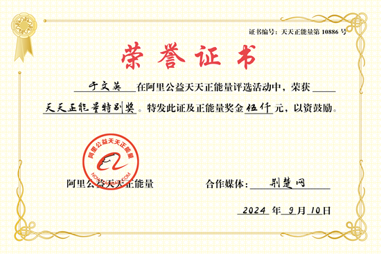 荊楚網(wǎng)(湖北日?qǐng)?bào)網(wǎng))訊(記者呂鑒蕾 通訊員黃旺宣、文娜)9月10日,荊楚網(wǎng)(湖北日?qǐng)?bào)網(wǎng))聯(lián)合阿里公益天天正能量,為“鑰匙姑娘”于文英頒發(fā)“天天正能量特別獎(jiǎng)”,獎(jiǎng)勵(lì)現(xiàn)金5000元。