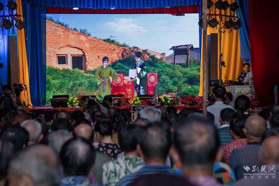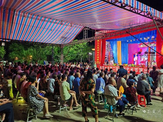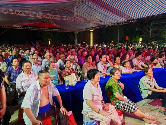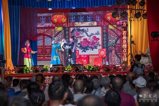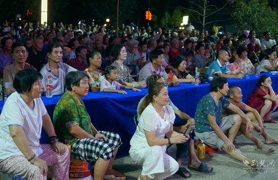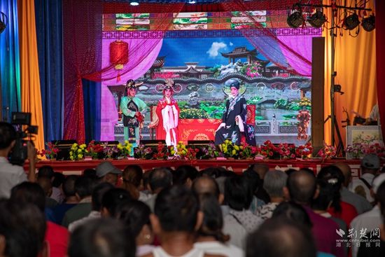當(dāng)晚7點,廣場上人聲鼎沸、鑼鼓喧天、座無虛席,來自周邊村鎮(zhèn)的老百姓偕老扶幼聚集于此,共襄楚劇盛會。