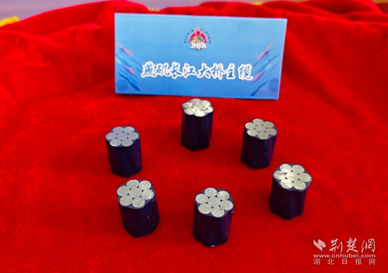 燕磯長江大橋的項(xiàng)目書記、工會主席喻林峰介紹,這6根鋼索來自燕磯長江大橋的主纜,它是2100兆帕的高強(qiáng)鋼索。燕磯長江大橋是世界最大跨徑四主纜懸索橋,同時也是世界首座不同垂度四主纜雙層鋼桁梁懸索橋。大橋一共有四根主纜,每根主纜有217根索股,每根索股由127根如此次捐贈的鋼索構(gòu)成。