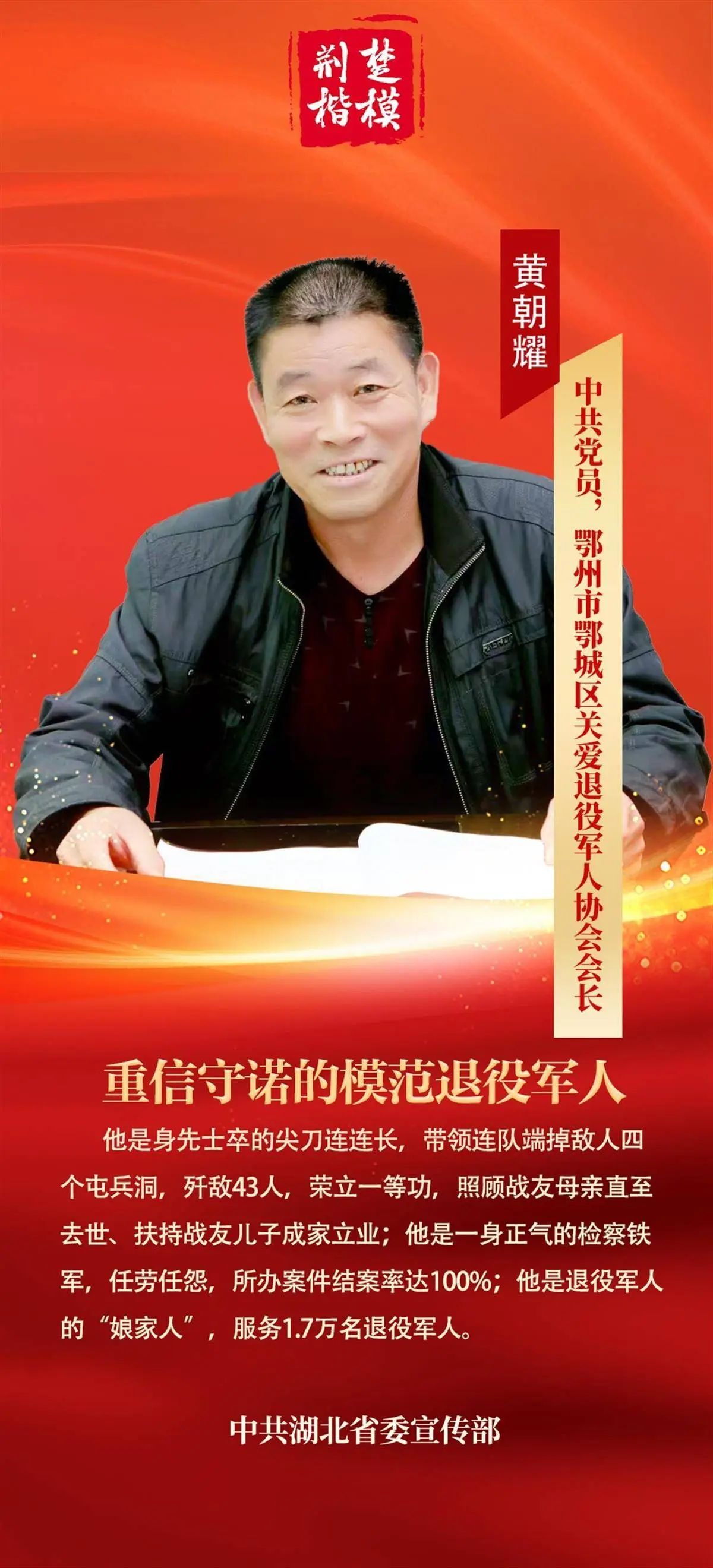 “荊楚楷?!标P于黃朝耀的頒獎詞為:他是身先士卒的尖刀連連長,帶領連隊端掉敵人四個屯兵洞,殲敵43人,榮立一等功,照顧戰(zhàn)友母親直至去世、扶持戰(zhàn)友兒子成家立業(yè);他是一身正氣的檢察鐵軍,任勞任怨,所辦案件結案率達100%;他是退役軍人的“娘家人”,服務1.7萬名退役軍人。2024年,他榮獲“全國模范退役軍人”榮譽稱號。