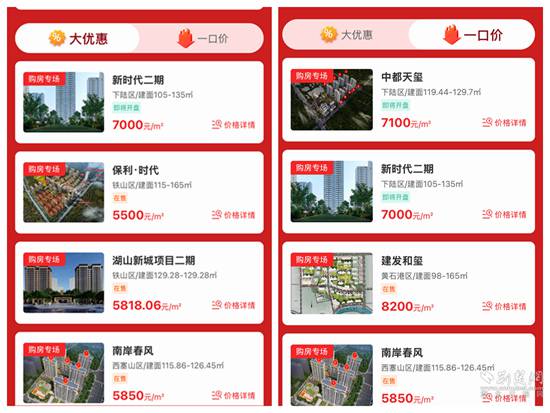 線上,該市在東楚優(yōu)房APP上,開辟“‘宜居黃石’春節(jié)返鄉(xiāng)安居”購(gòu)房專版,各房地產(chǎn)開發(fā)項(xiàng)目按照自愿原則拿出房源,下設(shè)“一口價(jià)”和“大優(yōu)惠”2個(gè)專欄。“一口價(jià)”專欄集中展示特價(jià)房源;“大優(yōu)惠”專欄集中展示特價(jià)房外的其它優(yōu)惠房源。