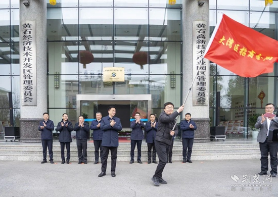 “期待你們凱旋而歸,出征!”授旗儀式上,黃石經(jīng)濟(jì)技術(shù)開(kāi)發(fā)區(qū)黨工委書(shū)記、管委會(huì)主任、鐵山區(qū)委書(shū)記萬(wàn)鼎為大灣區(qū)招商分局、三角招商分局、武漢招商分局、鐵山街道招商專班授旗,4名招商專班負(fù)責(zé)人鄭重接過(guò)旗幟。