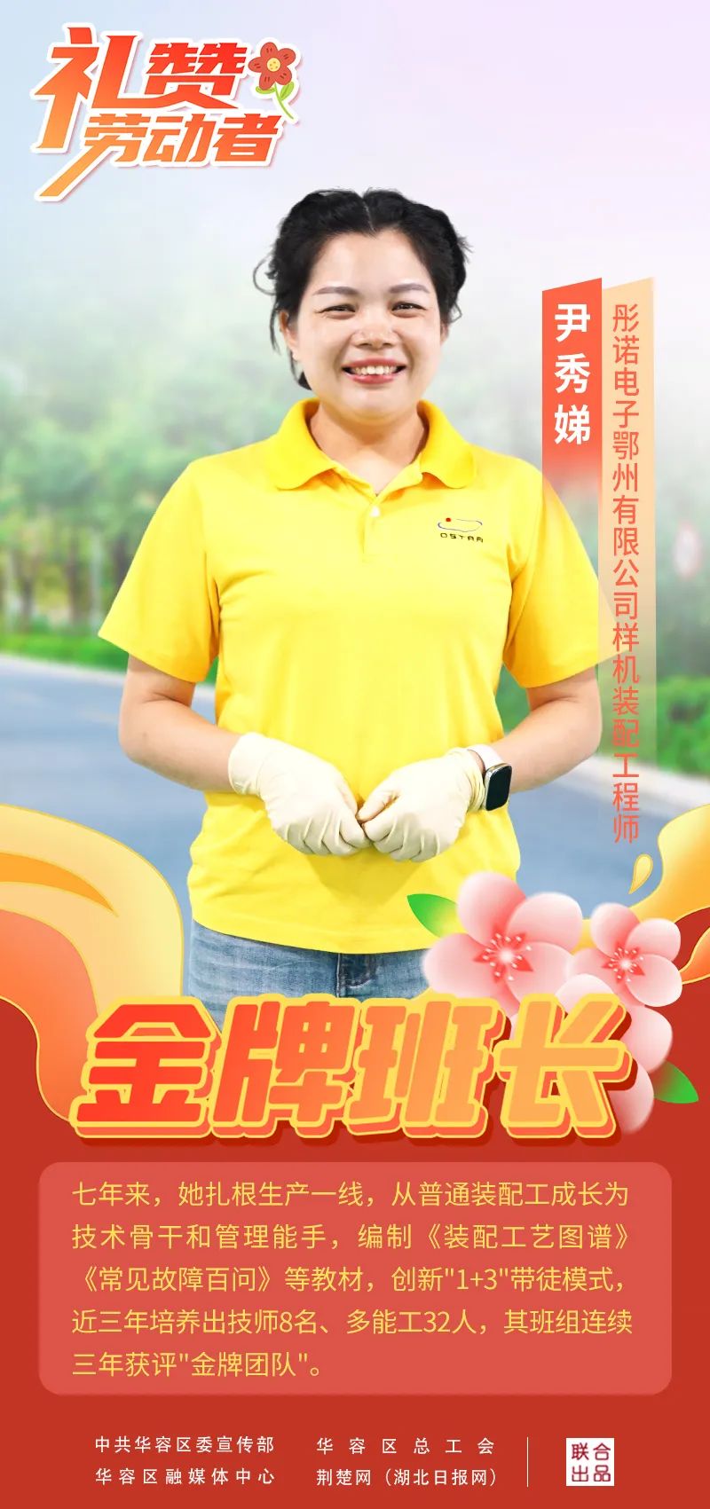 荊楚網(wǎng)(湖北日報網(wǎng))訊(記者陶輝 通訊員張潔瓊 肖運泉)17年前,她是廣東電子廠里連二極管正負極都分不清的懵懂女工。如今,她已成為彤諾電子生產(chǎn)車間“金牌班長”。4月29日,好消息傳來,尹秀娣榮獲鄂州五一勞動獎?wù)隆?/p>
