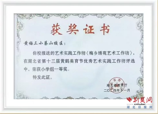 不完全統(tǒng)計(jì),17年來(lái),蔡山鎮(zhèn)中心小學(xué)共培養(yǎng)“繡娘”3000余人,挑花作品在省級(jí)評(píng)選中多次獲得金、銀、銅獎(jiǎng),學(xué)校被黃梅縣授予“黃梅挑花傳承基地”稱(chēng)號(hào)。