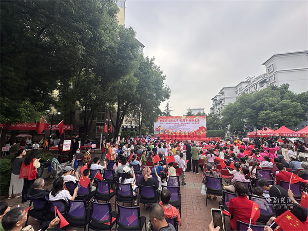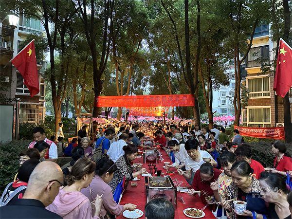 活動(dòng)中,文藝表演與互動(dòng)環(huán)節(jié)穿插進(jìn)行,帥鼓《歌唱祖國(guó)》、民樂《地道戰(zhàn)》、黃梅戲《再唱山歌給黨聽》輪番上演。當(dāng)54平方米的巨幅國(guó)旗緩緩展開,居民們揮舞小國(guó)旗齊唱贊歌,手中的紙飛機(jī)帶著美好祝愿飛向夜空,電子煙花綻放的瞬間,現(xiàn)場(chǎng)氣氛達(dá)到高潮。此外,三輪抽獎(jiǎng)、“最受歡迎菜品”評(píng)選等環(huán)節(jié),更讓活動(dòng)充滿驚喜與趣味。