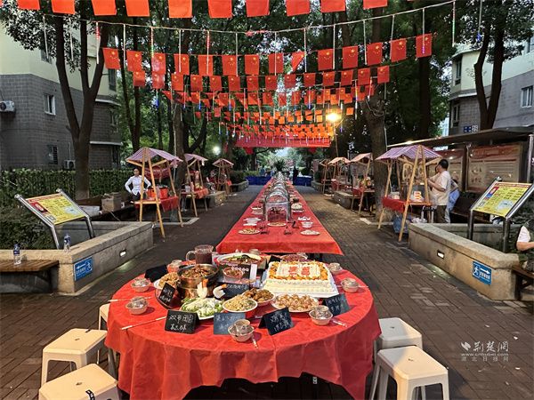 夜幕降臨,團(tuán)圓宴的香味彌漫開來。此前社區(qū)發(fā)布的“團(tuán)圓宴”菜品招募令得到熱烈響應(yīng),居民們帶著自家拿手菜齊聚一堂,轄區(qū)愛心企業(yè)和商戶也端來精心準(zhǔn)備的菜品。紅燒排骨色澤誘人、手工餃子飽含心意、梅菜扣肉香氣撲鼻……百余道家常菜擺滿長(zhǎng)桌,構(gòu)成一幅“百家宴、百家味”的溫馨畫卷。大家端著餐盤穿梭其間,分享美食、交流廚藝,陌生的鄰里因一道菜熟絡(luò)起來,熟悉的街坊借一碗湯增進(jìn)情誼。社區(qū)還聯(lián)合東湖康養(yǎng)養(yǎng)老服務(wù)中心邀請(qǐng)轄區(qū)10位高齡老人代表與祖國(guó)“同慶生”,全場(chǎng)齊唱《生日歌》,共同切分生日蛋糕,甜蜜的滋味伴著歡聲笑語,溫暖了在場(chǎng)每一位居民的心。