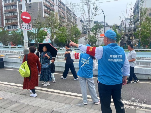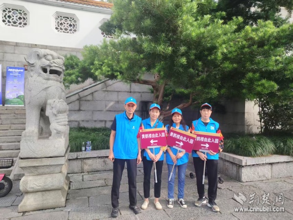 西廠口社區(qū)“市民園長”志愿團(tuán)隊(duì)在黃鶴樓景區(qū)開展文明引導(dǎo)與旅游咨詢。 通訊員供圖