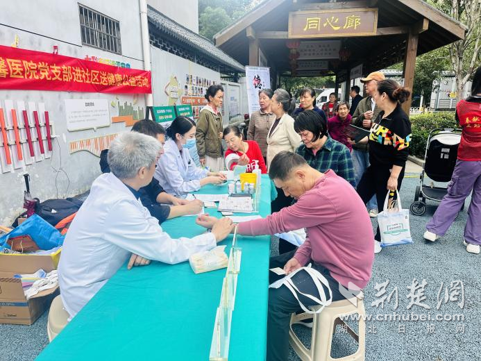 在另一角落,醫(yī)護(hù)人員耐心講解健康知識,社??ㄞk理區(qū)的漢口銀行工作人員忙個不停,為居民免費辦理社保卡升級業(yè)務(wù)。