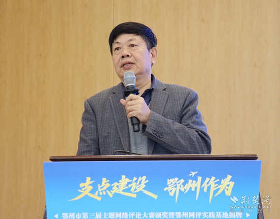 頒獎(jiǎng)活動(dòng)現(xiàn)場(chǎng),湖北省社會(huì)科學(xué)院原副院長(zhǎng)、省政府咨詢委員、長(zhǎng)江經(jīng)濟(jì)帶智庫(kù)聯(lián)盟秘書(shū)長(zhǎng)秦尊文受邀出席,并從網(wǎng)評(píng)的角度,圍繞“弘揚(yáng)花湖精神 助力支點(diǎn)建設(shè)”主題,發(fā)表了主旨演講。他結(jié)合最新公布的《中共中央關(guān)于制定國(guó)民經(jīng)濟(jì)和社會(huì)發(fā)展第十五個(gè)五年規(guī)劃的建議》,高屋建瓴分析了鄂州當(dāng)前的經(jīng)濟(jì)形勢(shì),提出了切實(shí)可行的建議。湖北省委直屬機(jī)關(guān)工委干部馮歡以中央網(wǎng)信辦網(wǎng)絡(luò)評(píng)論“創(chuàng)四優(yōu)”競(jìng)賽獲獎(jiǎng)作者身份,分享了自己多年網(wǎng)評(píng)文章寫(xiě)作的心得體會(huì),風(fēng)趣幽默、干貨滿滿。