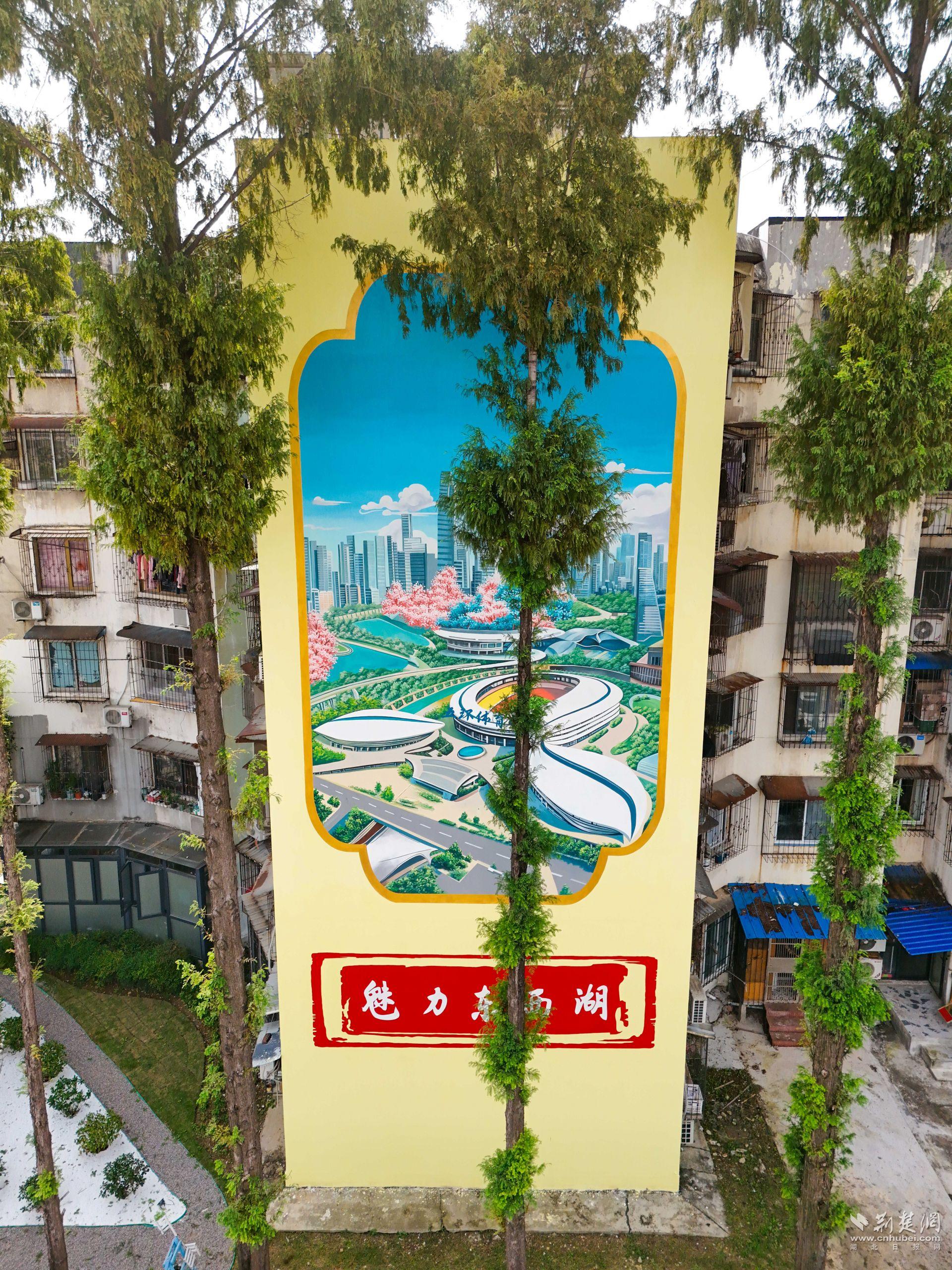 圍墻和彩繪也成了亮點(diǎn)。專(zhuān)業(yè)團(tuán)隊(duì)在相鄰居民樓外墻繪制325平方米主題壁畫(huà)——一面呈現(xiàn)“魅力東西湖”的城市風(fēng)貌,一面展現(xiàn)“幸福新常青”的生活圖景,成為社區(qū)新地標(biāo)。