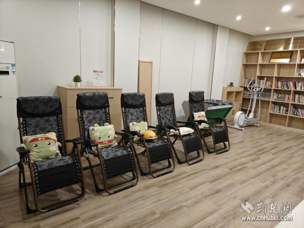 走進這個330平方米的升級版驛站,變化隨處可見。這里不僅有基礎(chǔ)的微波爐、冰箱、沙發(fā)等,更添置了共享淋浴間、聽書機、直飲機、空調(diào)等。曾經(jīng)的后廳,如今被打造成一個多功能“潮玩空間”——午休時間,拉上窗簾,這里是配備了舒適躺椅的靜謐午睡室;工作之余,這里又變身為熱鬧的“社交俱樂部”,大家可以一起看電視、玩桌游,徹底放松身心。