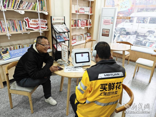 外賣小哥在“聽書角”聽書。 通訊員供圖