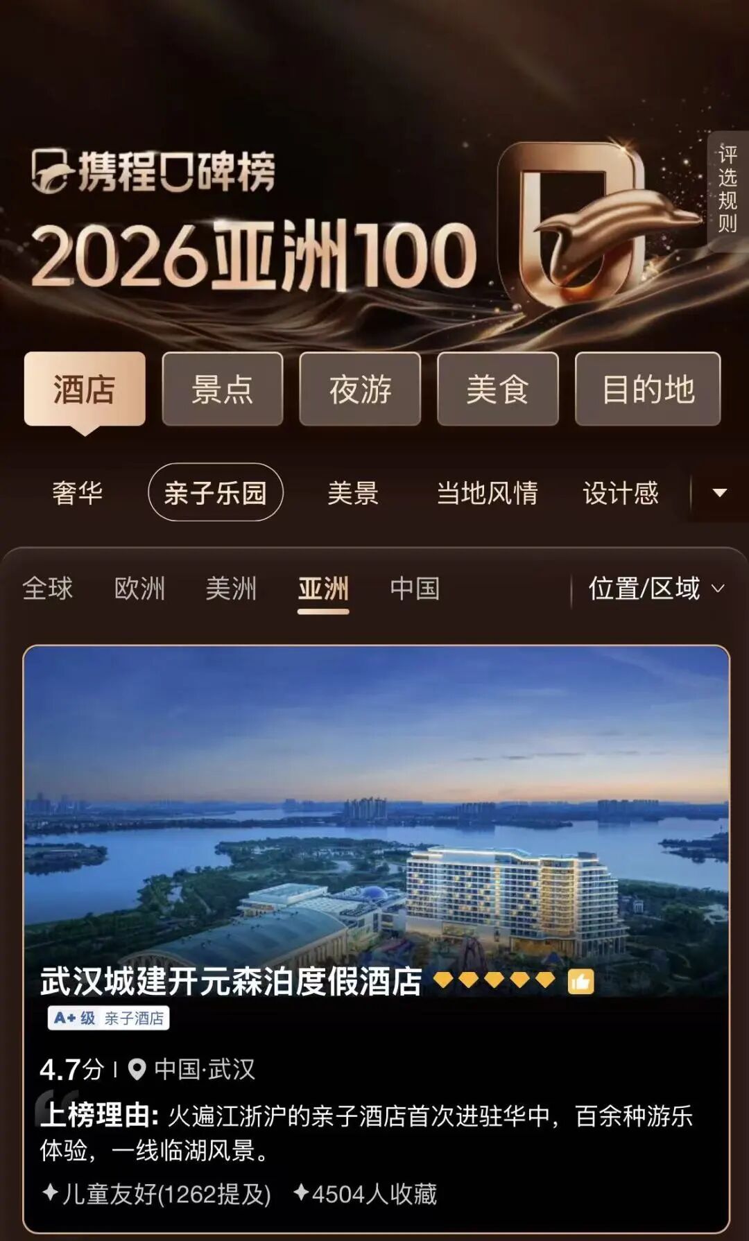 近日,攜程平臺發(fā)布《攜程口碑榜2026年度榜單》,武漢城建開元森泊度假酒店成功上榜亞洲親子樂園酒店百強,位列亞洲第58位、國內第29位,成為湖北省唯一上榜的酒店。