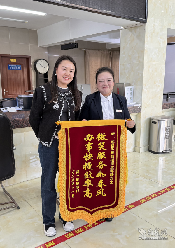 荊楚網(wǎng)(湖北日報網(wǎng))訊(通訊員劉麗)近日,武昌區(qū)黃鶴樓街道便民服務(wù)中心工商窗口上演了暖心一幕。一位商戶代表將一面書寫著“微笑服務(wù)如春風(fēng),辦事快捷效率高”的錦旗,鄭重送到工作人員郭靜手中,對她即使在生病住院期間仍堅持線上為商戶排憂解難的敬業(yè)精神表達誠摯謝意。