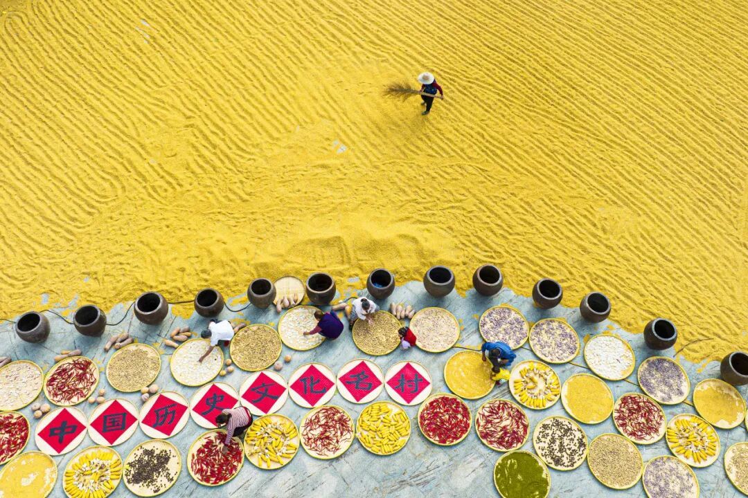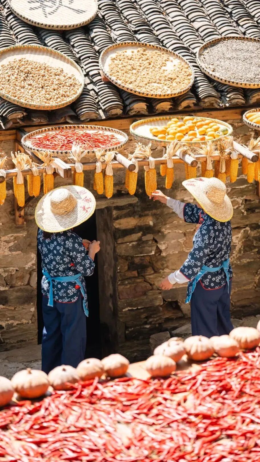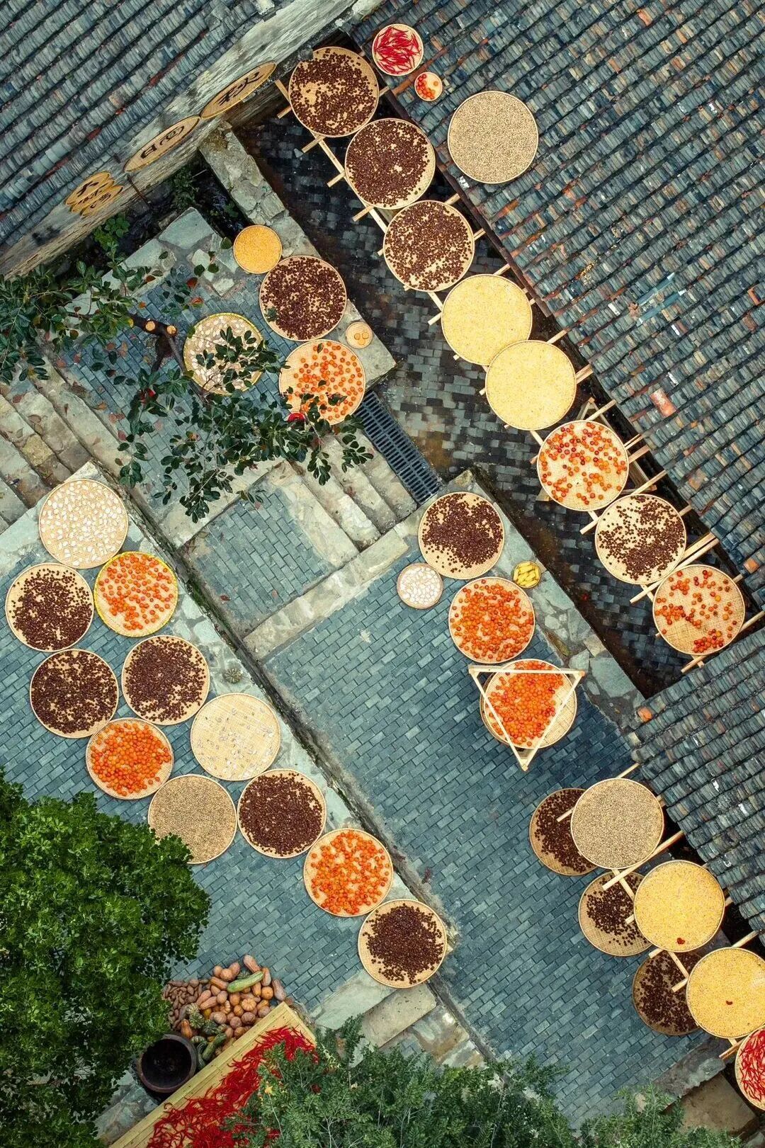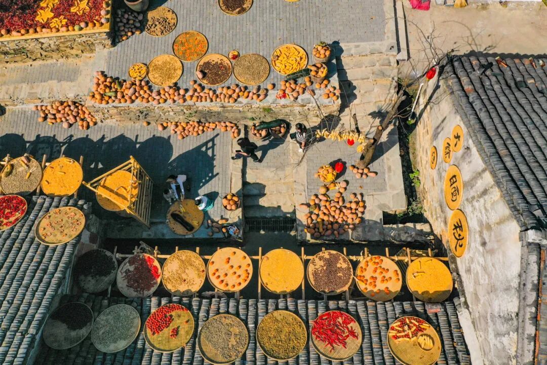 這不是擺設或表演,是真實的生活場景。家家戶戶門口擺放的竹匾里,晾曬的是他們一年勞作的收獲。