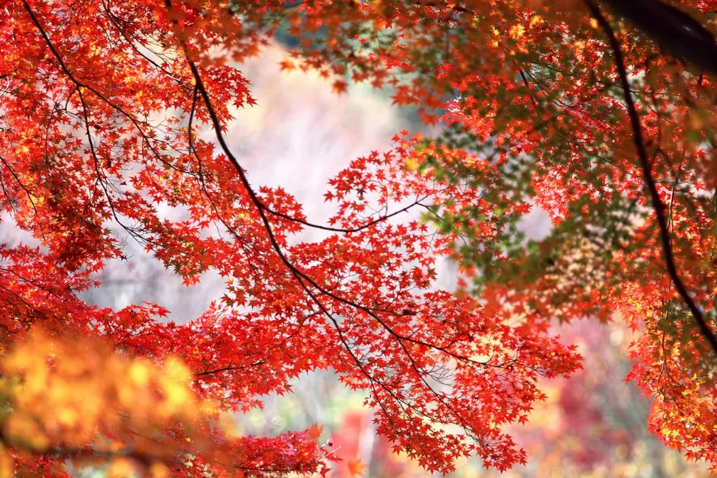 綿延的山谷像打翻的調色盤,紅色是主調,其間點綴著金、橙和綠色,錯落有致,構成一幅溫暖的秋景長卷。