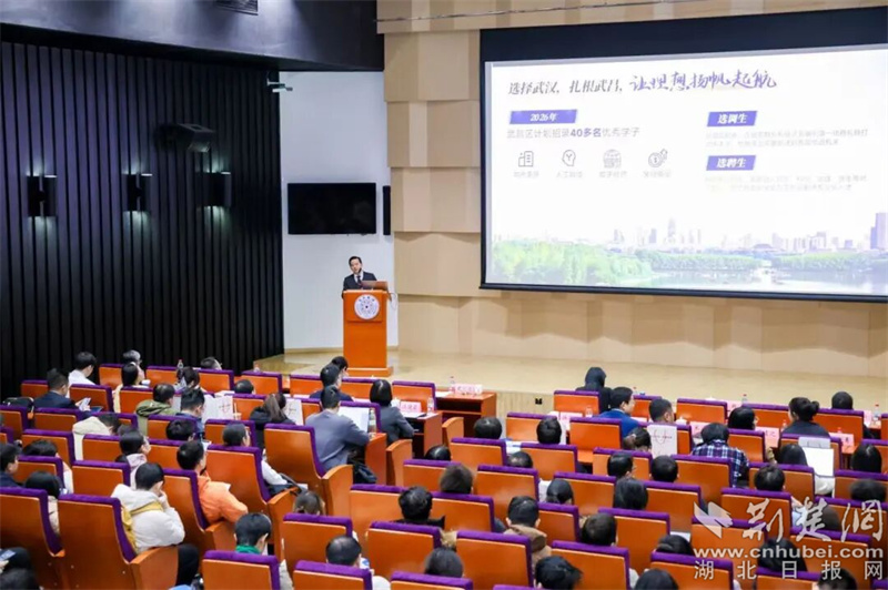 在用人單位推介環(huán)節(jié),武昌區(qū)委常委、組織部部長施國宏以《三生有幸 筑夢江城》為題,從“歷史底蘊”“現(xiàn)代產(chǎn)業(yè)”和“生態(tài)宜居”等維度,介紹了武昌作為武漢重要城區(qū)的獨特魅力——從黃鶴樓的千年文化到長江沿岸的現(xiàn)代樓宇經(jīng)濟,從東湖綠道的生態(tài)長廊到“環(huán)沙湖經(jīng)濟帶”的創(chuàng)新活力,一個開放包容、充滿機遇的武昌形象吸引了在場眾多學(xué)子。