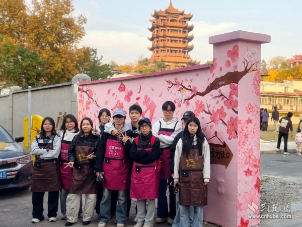 活動(dòng)首日,志愿者們?cè)缭鐏?lái)到現(xiàn)場(chǎng),分工協(xié)作完成物料搬運(yùn)、防護(hù)鋪設(shè)等準(zhǔn)備工作。隨著畫(huà)筆起落,原本單調(diào)的灰墻被溫柔的粉色調(diào)漸漸覆蓋,“武漢”兩個(gè)大字輪廓清晰浮現(xiàn),兩側(cè)櫻花枝椏初現(xiàn)雛形。在冬日的暖陽(yáng)下,志愿者們俯身勾勒、抬手描繪,讓冰冷墻面開(kāi)始煥發(fā)浪漫生機(jī)。