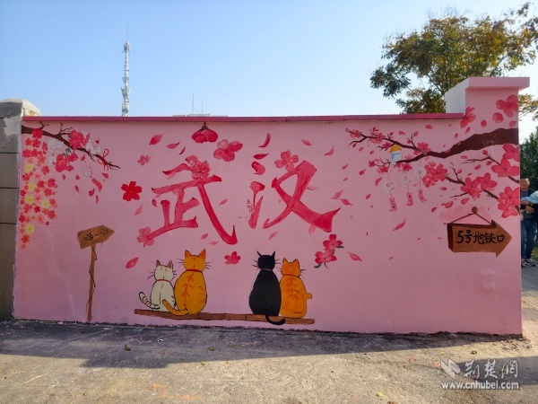 次日,創(chuàng)作進(jìn)入精修階段。志愿者們細(xì)致調(diào)整“武漢”字樣的色彩飽和度,用粉白顏料層層暈染出飛揚(yáng)的櫻花花瓣。四只形態(tài)各異的貓咪相依蹲坐,靈動(dòng)可愛(ài);特意添加的“5號(hào)地鐵口”指引牌等實(shí)用元素,更讓作品兼具藝術(shù)性與功能性。創(chuàng)作過(guò)程中,不斷有居民和游客駐足觀(guān)賞,主動(dòng)詢(xún)問(wèn)設(shè)計(jì)理念?!拔覀兿胪ㄟ^(guò)櫻花、貓咪等元素,展現(xiàn)武漢的浪漫與煙火氣?!敝驹刚咭贿呎{(diào)色一邊向圍觀(guān)群眾講解。