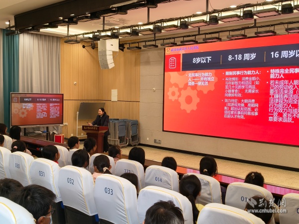 活動中,武昌區(qū)人民法院白沙洲法庭余意法官以《未成年人民事法律行為效力》為題,用“未成年人網(wǎng)購貴重物品是否有效”等案例,按年齡分層解析法律責(zé)任邊界,讓學(xué)生快速厘清不同階段的民事行為效力,直觀感受憲法及民事法律對青少年權(quán)益的保護(hù)。