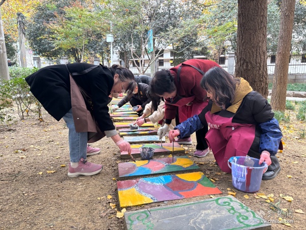 30余名黨員與社區(qū)居民攜手執(zhí)筆,在社區(qū)能人的指導(dǎo)下,依據(jù)設(shè)計(jì)圖稿細(xì)心勾勒線(xiàn)條,精心調(diào)配赭石、石青、石綠等傳統(tǒng)礦物色彩,悉心填充花瓣、枝葉。草坪里原本素樸的地磚漸漸綻放出繽紛圖景:象征革命精神的紅色印記、勾勒武昌古城風(fēng)貌的文化符號(hào),以及依循“十二花令”鋪陳的水仙、桃花、菊花等時(shí)令花卉與梅蘭竹菊的清雅風(fēng)骨藝術(shù)化呈現(xiàn)。