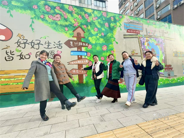 “復興時光里”特色手繪墻成現(xiàn)場打卡熱點,墻上不僅繪有社區(qū)特色地圖與“十五分鐘生活圈”元素,還承載著居民的共同記憶,為社區(qū)文化建設添上靚麗一筆,成了鄰里溫情與社區(qū)活力的見證。