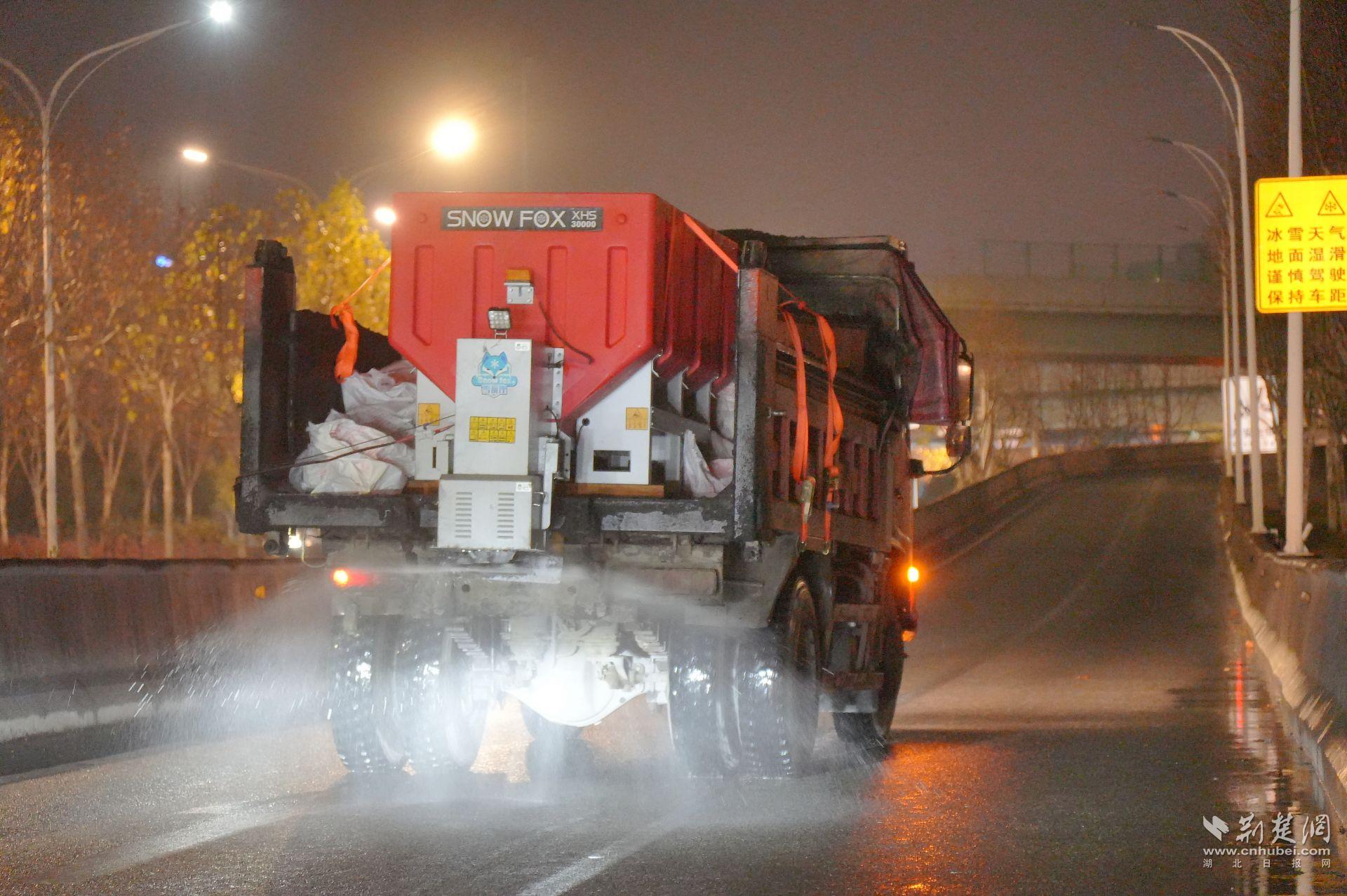 指令發(fā)出后,一線力量迅速到位。22時(shí)左右,硚孝高速匝道口,區(qū)服投臨空港市政環(huán)衛(wèi)公司的三臺融雪劑撒布機(jī)同步作業(yè)。融雪劑被均勻鋪撒在匝道和橋面,為后續(xù)可能出現(xiàn)的結(jié)冰提前“打底”。