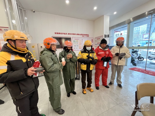 武昌區(qū)總工會維權(quán)服務(wù)部負責(zé)人夏巨波與街道工會工作人員一邊分發(fā)慰問物資,一邊與大家親切交談:“雪天路滑,騎車千萬要慢行,安全第一。”“驛站里備了熱水和微波爐,累了隨時進來歇腳,別凍著自己?!?/p>