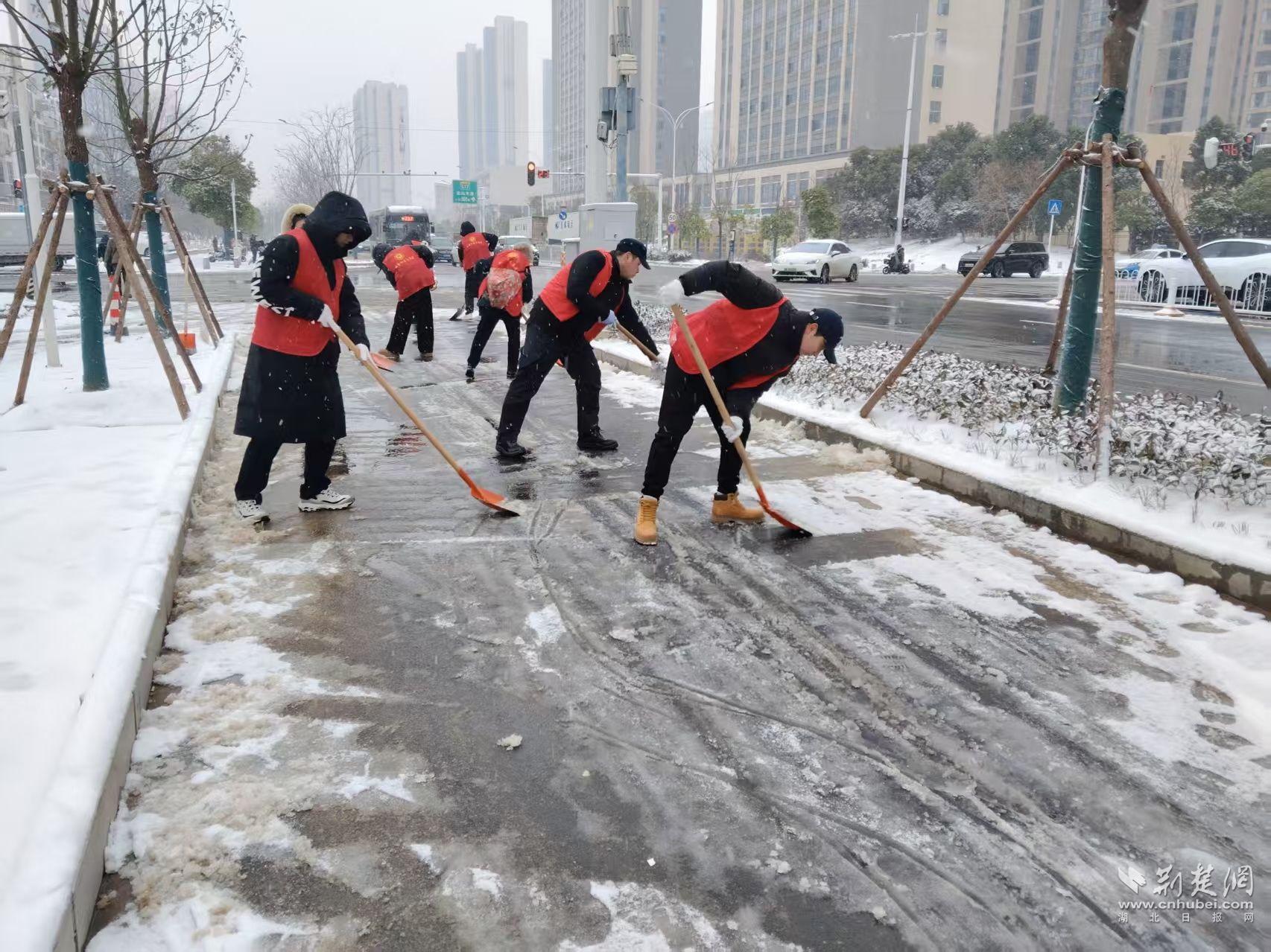上午9點,在徑河街稻香社區(qū),徑東三路、創(chuàng)想路等路段因結冰濕滑難行。社區(qū)一聲號召,黨員、物業(yè)人員,以及湖北廣電、海之最食品廠、森六汽車配件、三葉士林汽車配件等企業(yè)的職工近30人快速響應,一支由多元力量組成的志愿隊伍完成集結。