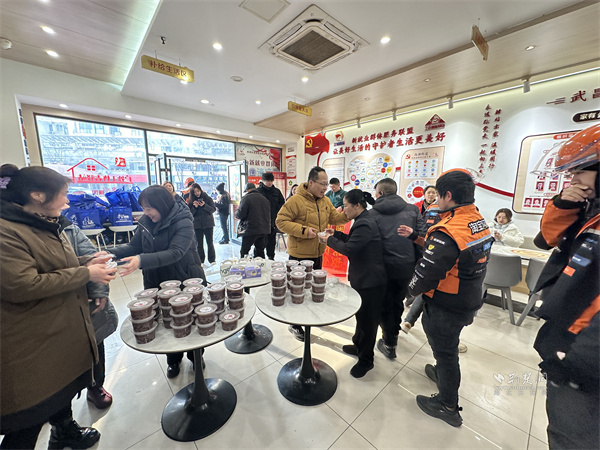活動(dòng)現(xiàn)場(chǎng),“暖心聯(lián)盟”企業(yè)劉胖子家常菜館中央花園店開展“暖心臘八粥 暖胃更暖心”服務(wù),提供百余份臘八粥。工作人員將臘八粥分裝至便攜餐盒,搭配一次性餐具,供戶外工作者排隊(duì)領(lǐng)取,方便其攜帶食用。外賣小哥夏博文表示,驛站每逢節(jié)日都會(huì)組織關(guān)懷活動(dòng),剛開完晨會(huì)就能吃上熱粥,切實(shí)感受到“娘家人”的關(guān)懷,渾身充滿干勁。