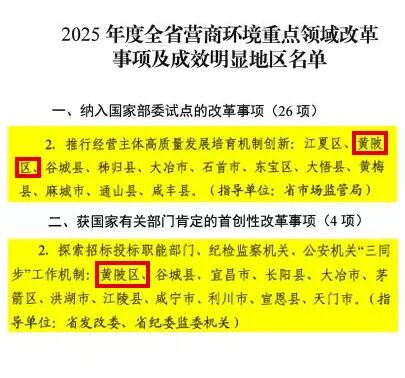 近日,湖北省優(yōu)化營商環(huán)境領(lǐng)導(dǎo)小組對2025年度全省優(yōu)化營商環(huán)境重點領(lǐng)域改革事項及成效明顯地區(qū)進行通報表揚。其中,黃陂政務(wù)服務(wù)領(lǐng)域兩項創(chuàng)新改革納入國家部委試點,獲國家有關(guān)部門肯定,彰顯區(qū)域改革擔(dān)當(dāng)與服務(wù)實力。