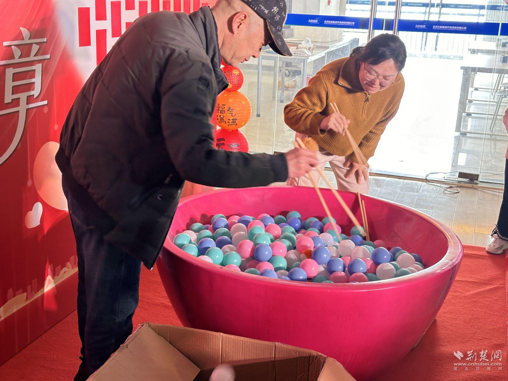 隨后,互動(dòng)環(huán)節(jié)正式開啟。核心區(qū)域的巨型“團(tuán)圓碗”成為焦點(diǎn),碗中盛放象征團(tuán)圓的“元宵球”,員工們依次上場,用長筷在30秒內(nèi)夾取“元宵”,現(xiàn)場計(jì)數(shù)、排名,氣氛迅速升溫。