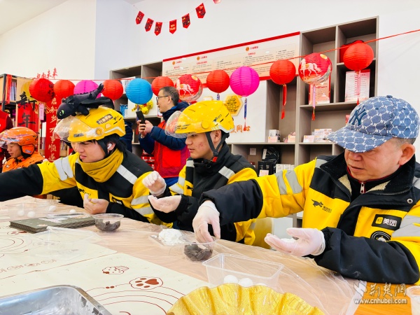 活動(dòng)現(xiàn)場(chǎng),手工DIY區(qū)準(zhǔn)備了糯米粉、黑芝麻餡、豆沙餡等原材料,黃鶴樓消防站的消防員與外賣騎手、快遞員們圍坐在一起,揉面、包餡、搓圓,體驗(yàn)親手制作湯圓的樂趣。