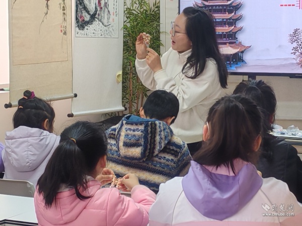 隨后,“閱讀媽媽”將話(huà)題自然引向非遺文化:“你們知道嗎?黃鶴樓不僅出現(xiàn)在詩(shī)詞里,還藏在楚繡的針腳中,藏在剪紙的紋樣里……”她通過(guò)展示精美的非遺作品,解讀楚繡中黃鶴紋樣的寓意,講述剪紙藝術(shù)如何再現(xiàn)黃鶴樓的雄姿。在她的娓娓道來(lái)中,黃鶴樓與荊楚非遺的淵源徐徐展開(kāi),孩子們聽(tīng)得入神,眼中閃爍著好奇與向往。