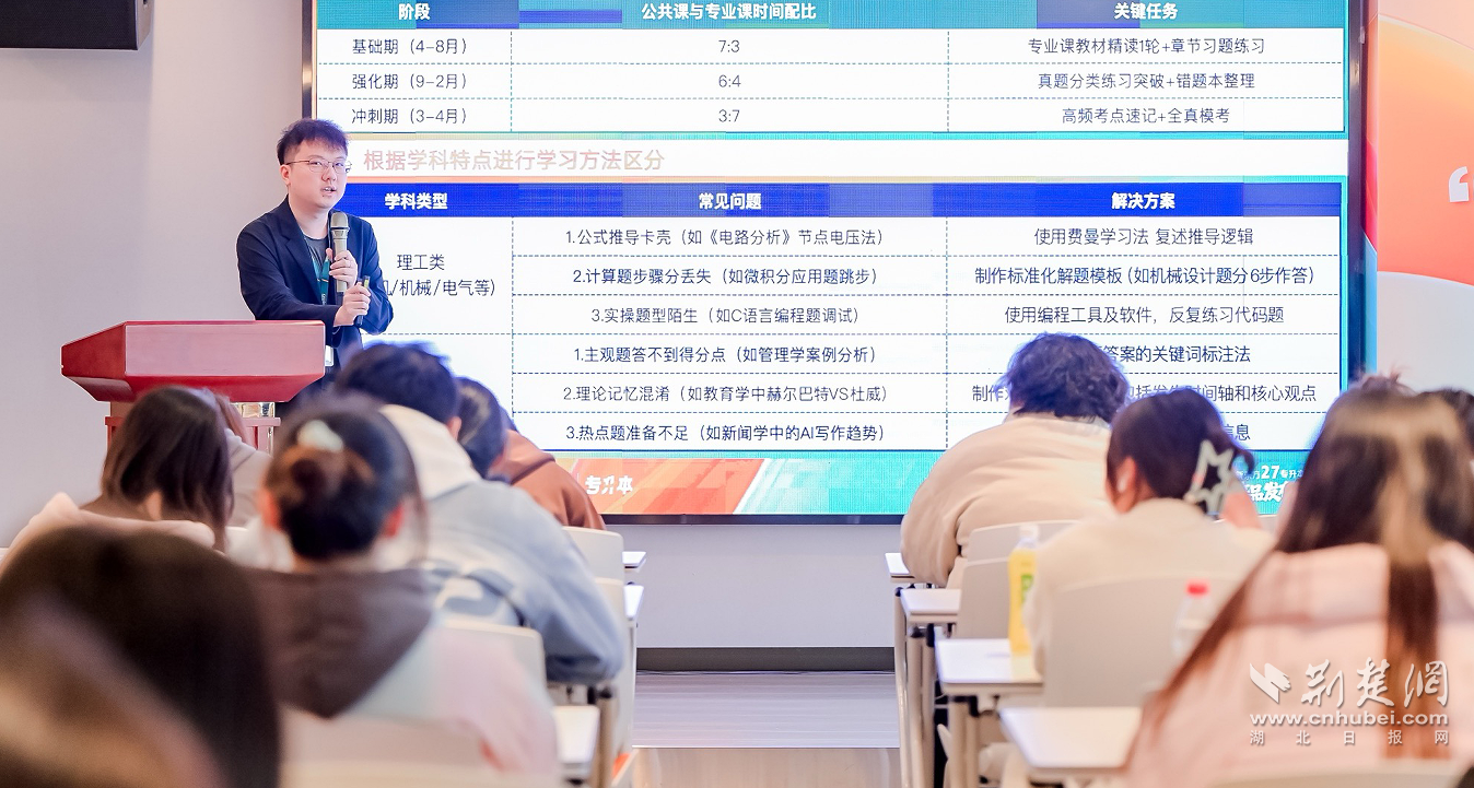 備考先知情,方能贏在起點。發(fā)布會上,教學負責人胡誠林,圍繞湖北省專升本公共課考情回顧及2027備考規(guī)劃展開詳細分享。他重點拆解了《大學英語》這一核心公共課的考試要求、題型迭代規(guī)律及難度變化趨勢,針對考生最關(guān)心的詞匯積累、語法掌握、閱讀理解、書面寫作四大模塊,提供了可落地、可執(zhí)行的備考策略。從詞匯記憶的高效方法、語法考點的重點突破,到閱讀技巧的精準運用、寫作能力的分層提升,胡誠林老師進行了全方位、系統(tǒng)化的解析,為考生搭建起清晰的公共課備考框架,幫助大家精準把握備考節(jié)奏,做到游刃有余。