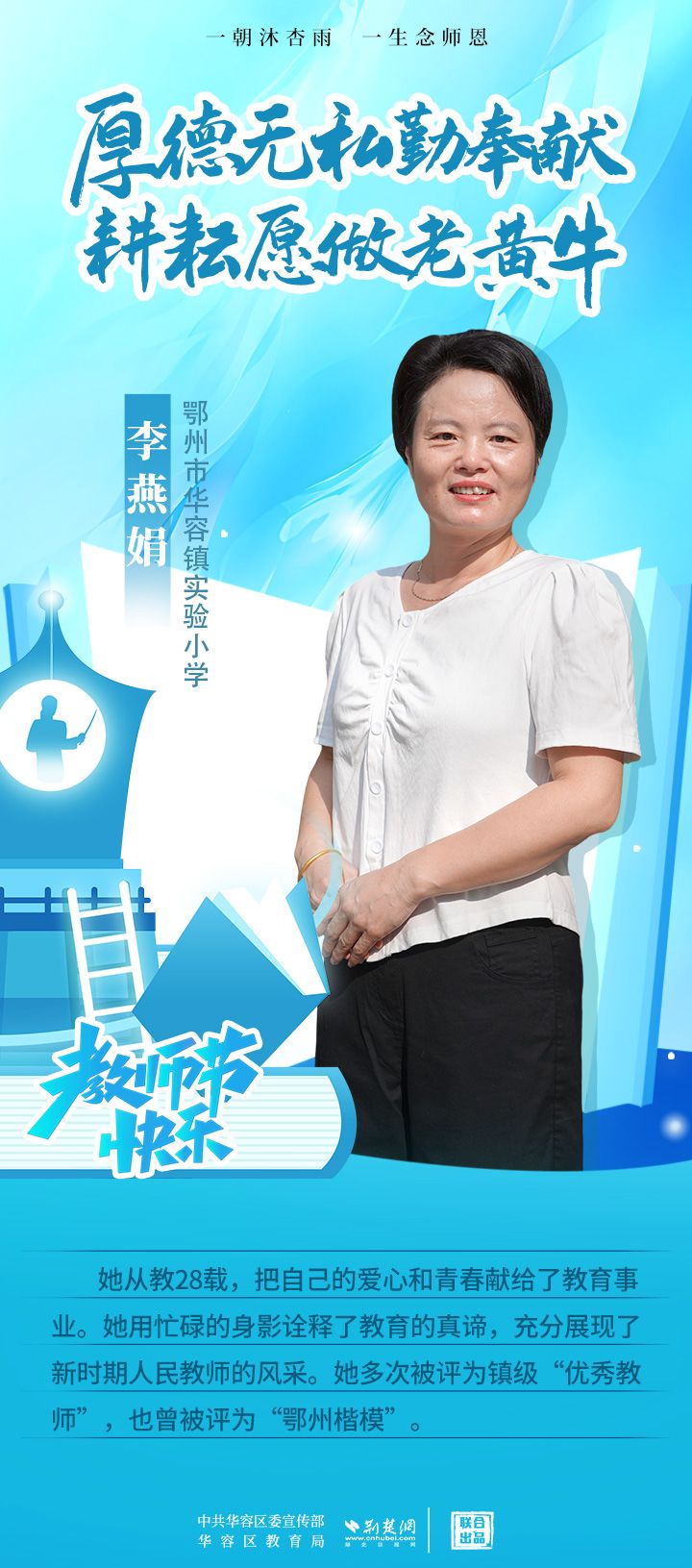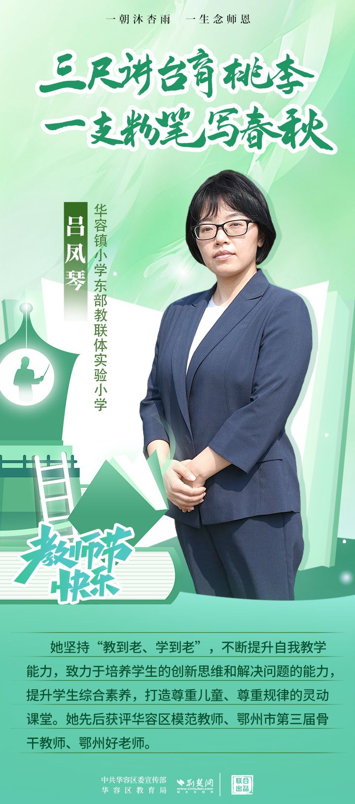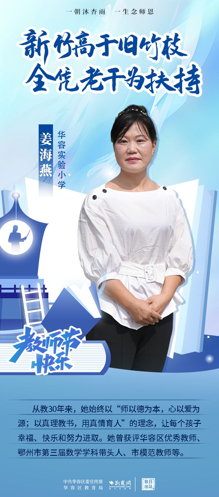 荊楚網(wǎng)(湖北日?qǐng)?bào)網(wǎng))訊(記者 劉璐 通訊員 張曉琴)百年大計(jì),教育為本;教育大計(jì),教師為本。在教師節(jié)來(lái)臨之際,中共華容區(qū)委宣傳部聯(lián)合荊楚網(wǎng)(湖北日?qǐng)?bào)網(wǎng))推出創(chuàng)意海報(bào),姜海燕、廖進(jìn)等6名老師入選“荊楚好老師”群星計(jì)劃。她們?彰顯了新時(shí)代教師的風(fēng)采,?為教育事業(yè)的發(fā)展貢獻(xiàn)了重要力量?,向了不起的她們致敬!