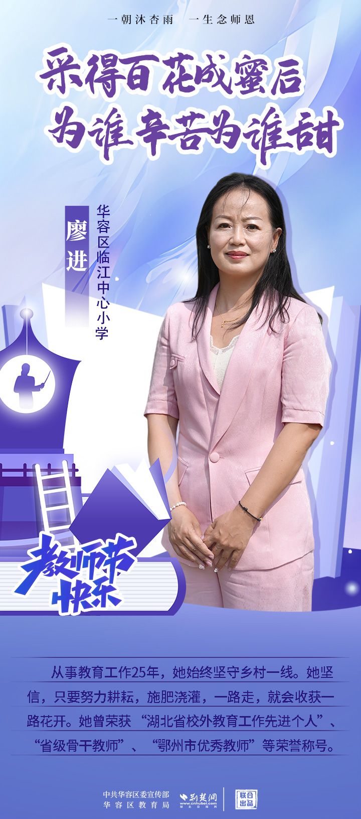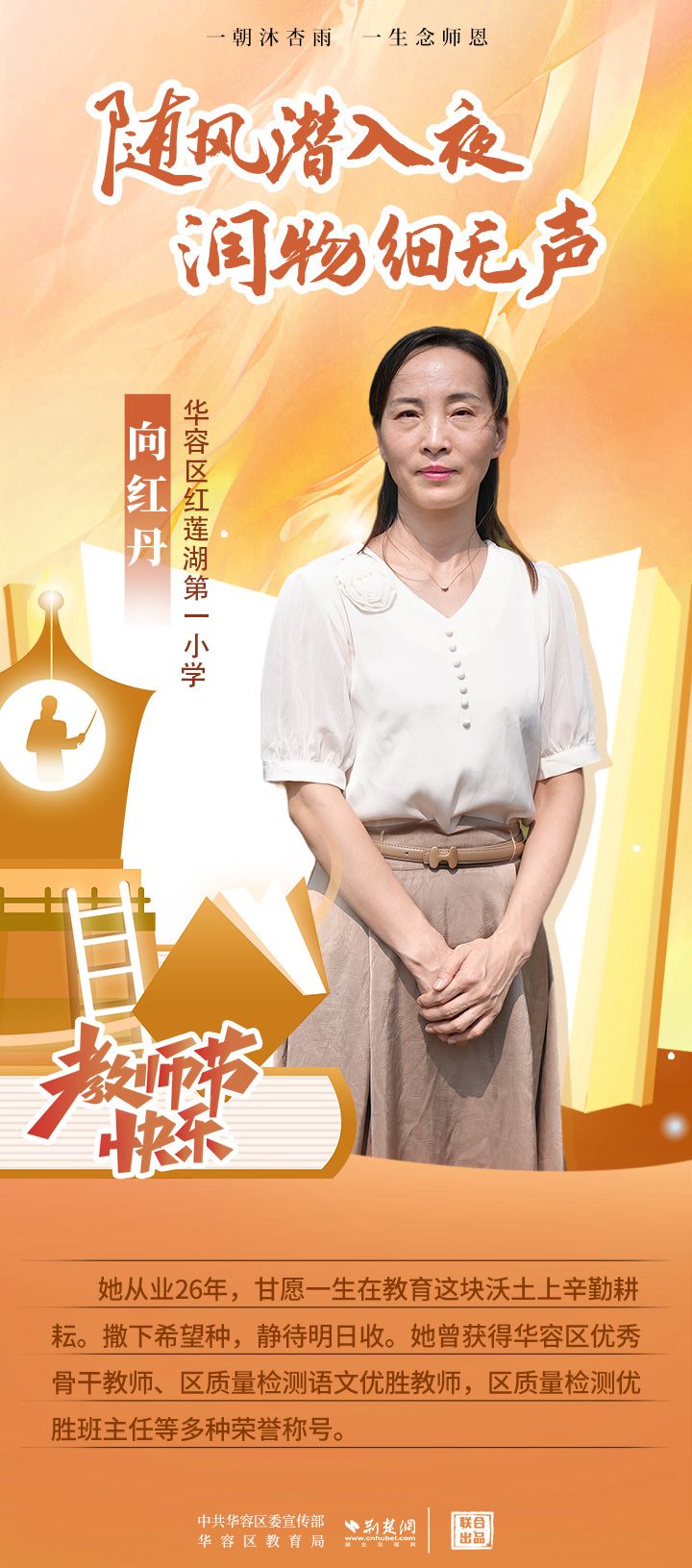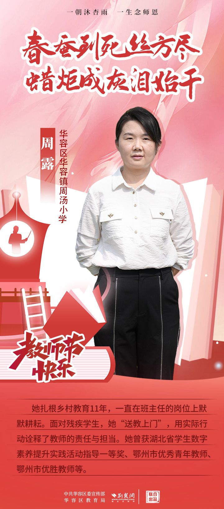 荊楚網(wǎng)(湖北日?qǐng)?bào)網(wǎng))訊(記者 劉璐 通訊員 張曉琴)百年大計(jì),教育為本;教育大計(jì),教師為本。在教師節(jié)來(lái)臨之際,中共華容區(qū)委宣傳部聯(lián)合荊楚網(wǎng)(湖北日?qǐng)?bào)網(wǎng))推出創(chuàng)意海報(bào),姜海燕、廖進(jìn)等6名老師入選“荊楚好老師”群星計(jì)劃。她們?彰顯了新時(shí)代教師的風(fēng)采,?為教育事業(yè)的發(fā)展貢獻(xiàn)了重要力量?,向了不起的她們致敬!