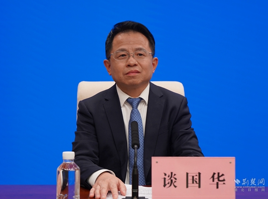 黃石市商務(wù)局黨組書(shū)記、局長(zhǎng)談國(guó)華答記者問(wèn)。金康 攝