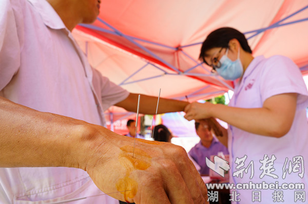 46歲的黃炳程走路時,常常用手撐著腰。今年3月,他突發(fā)腰痛?,F(xiàn)場,宜城中醫(yī)醫(yī)院針灸科主治醫(yī)師林蘭茹在其手部扎完數枚針后,他大呼止痛效果很明顯。